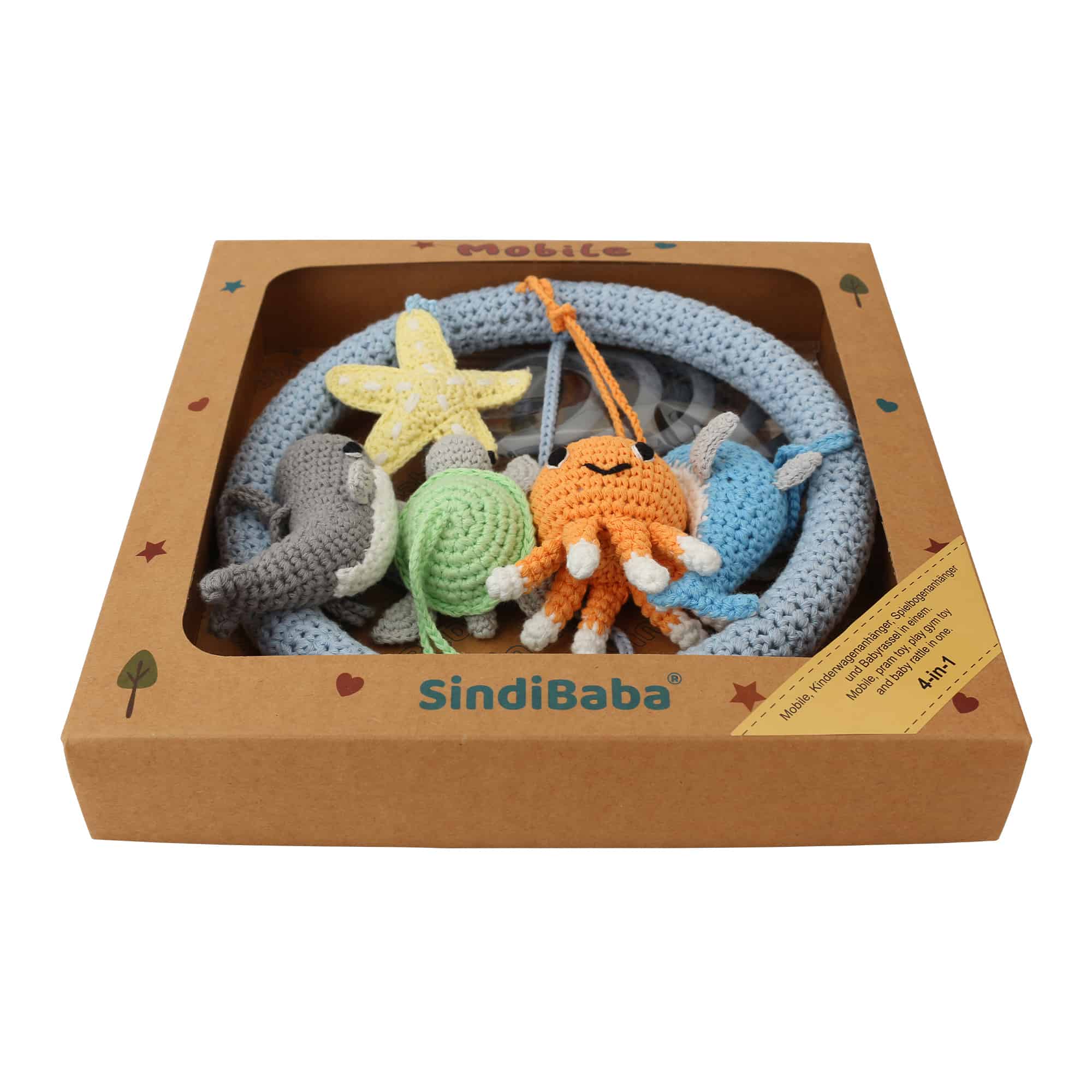 Handgefertigtes Baby-Mobile mit abnehmbaren Rasselfiguren im Meerestiere-Motiv. Vier gehäkelte Tierfiguren und eine zentrale Dekorfigur lassen sich flexibel als Mobile, Greifrassel oder Hängespielzeug weiterverwenden.
