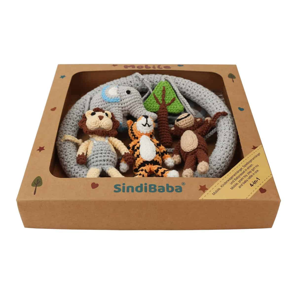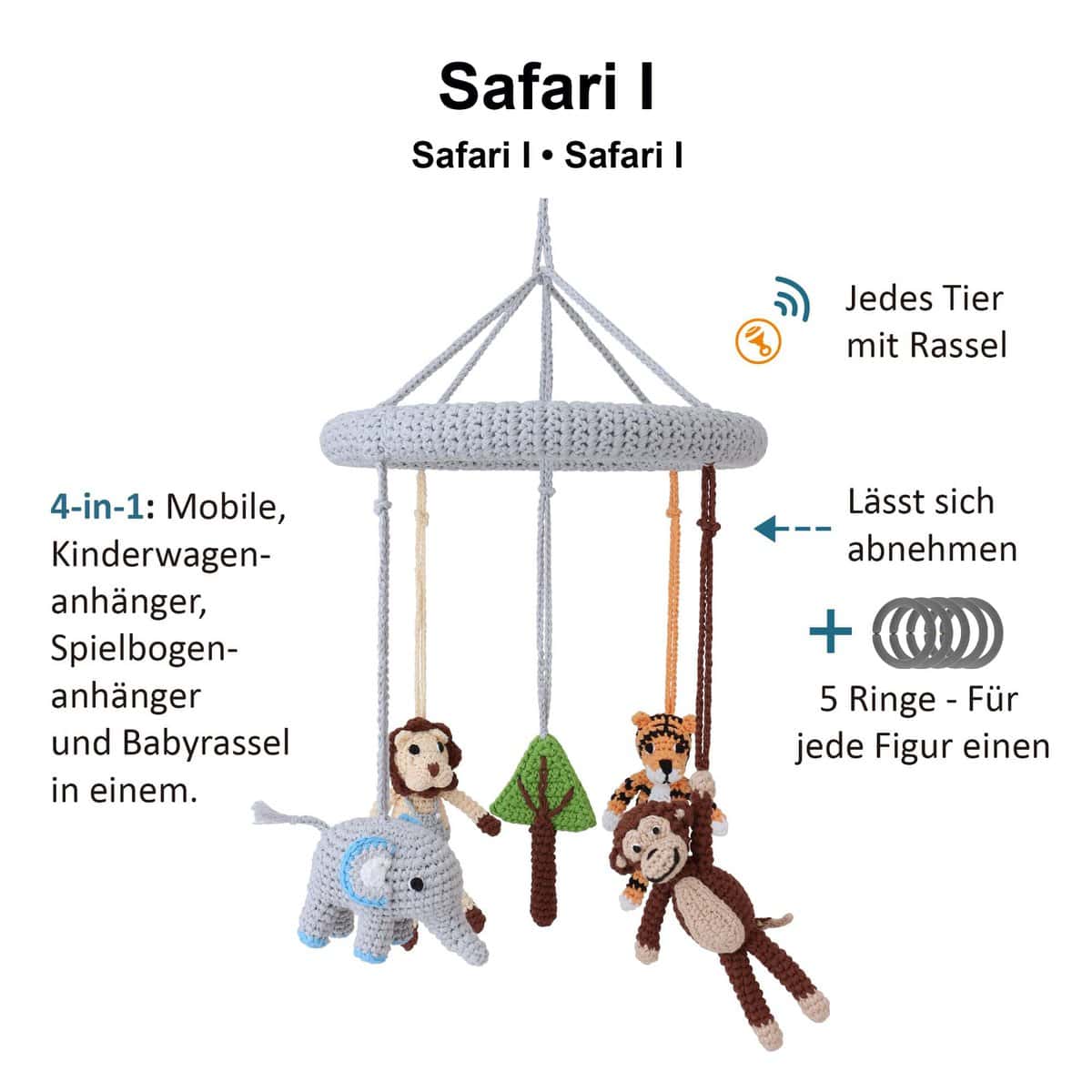 Handgefertigtes Baby-Mobile mit abnehmbaren Rasselfiguren im Safari-Motiv. Vier gehäkelte Tierfiguren und eine zentrale Dekorfigur lassen sich flexibel als Mobile, Greifrassel oder Hängespielzeug weiterverwenden.