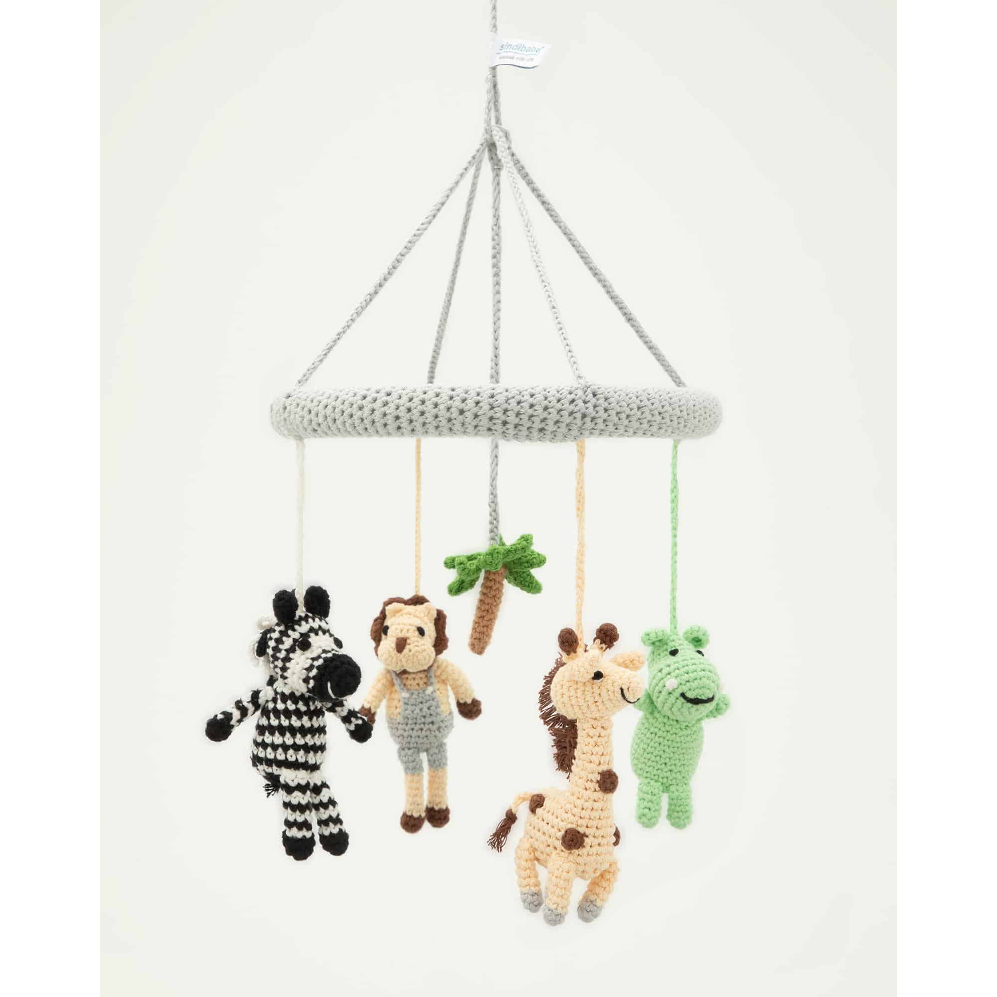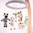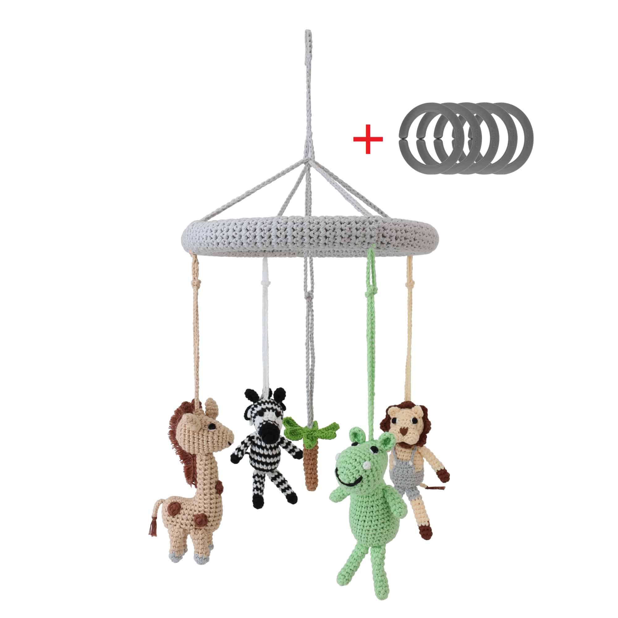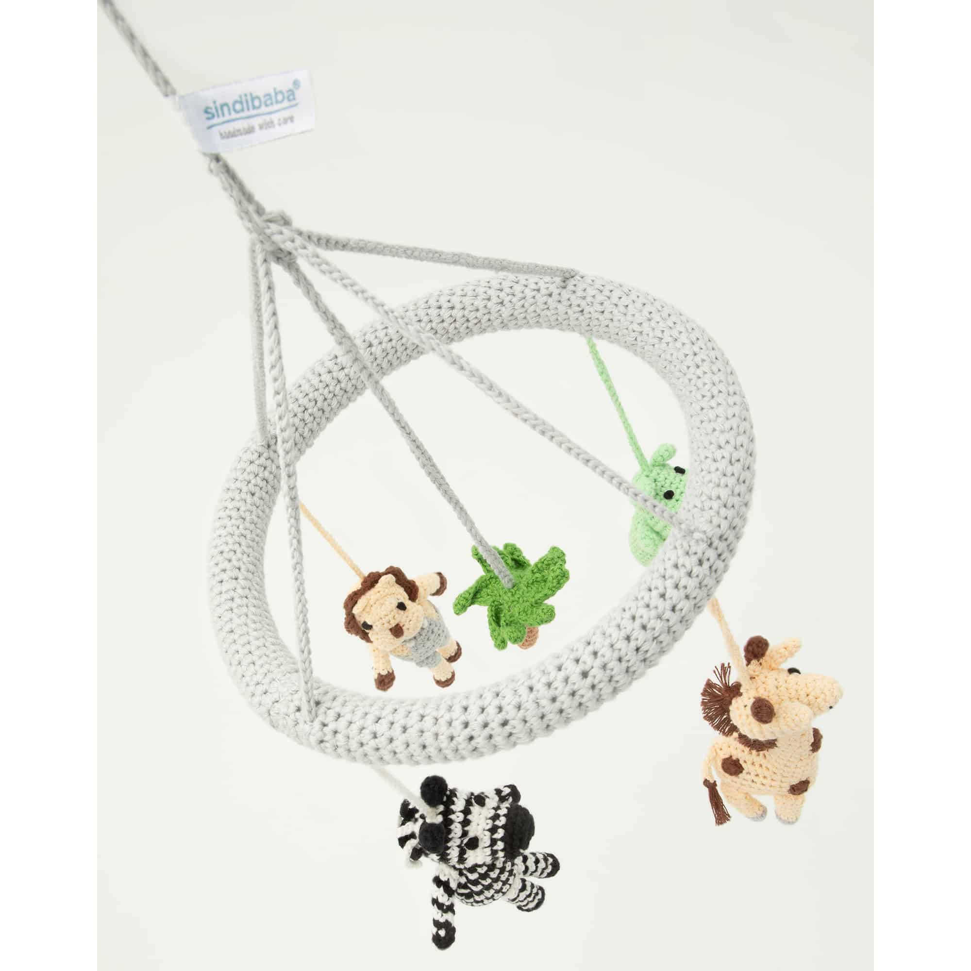 Handgefertigtes Baby-Mobile mit abnehmbaren Rasselfiguren im Safari-Motiv. Vier gehäkelte Tierfiguren und eine zentrale Dekorfigur lassen sich flexibel als Mobile, Greifrassel oder Hängespielzeug weiterverwenden.