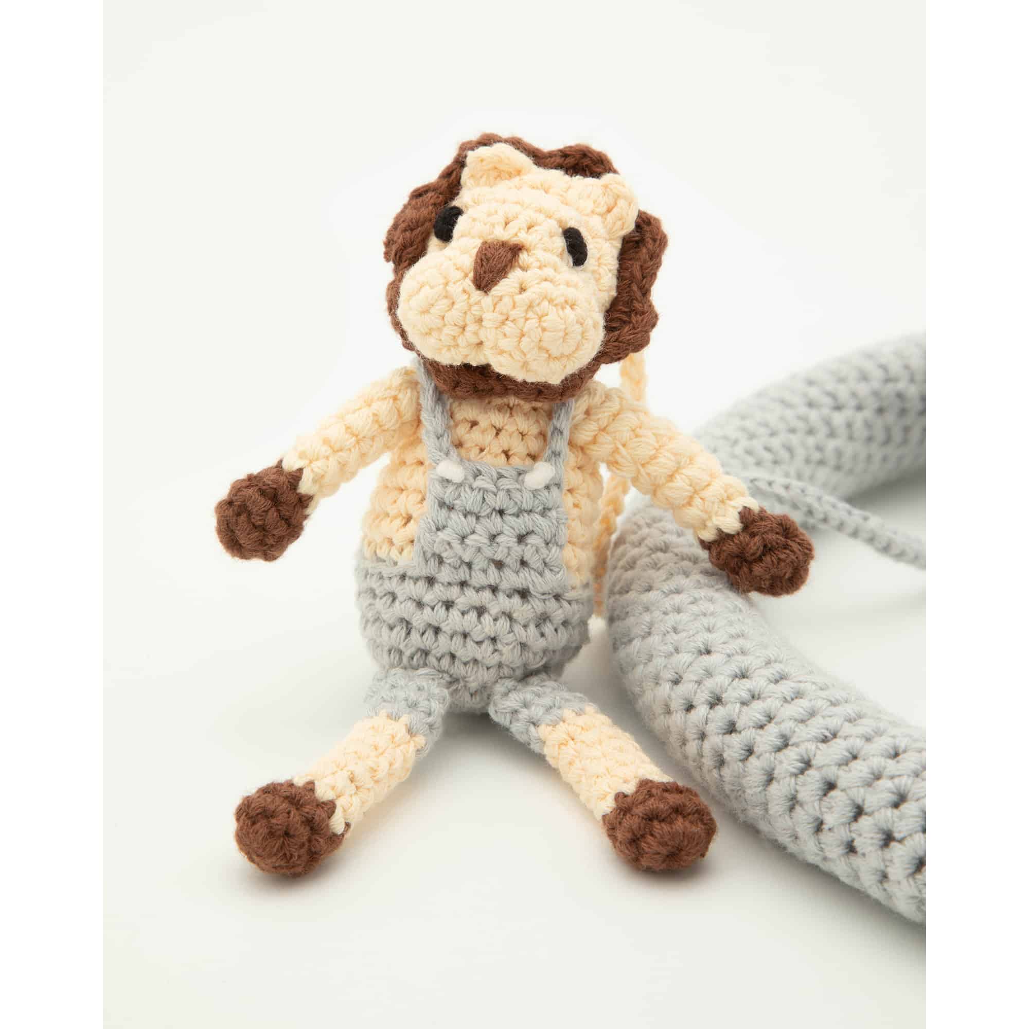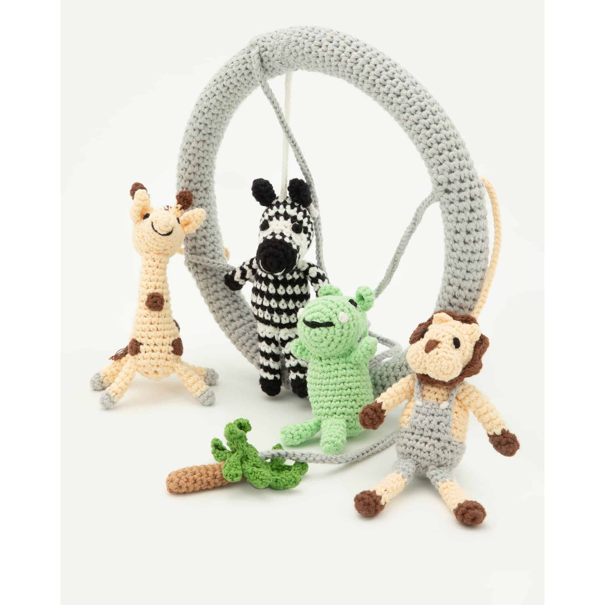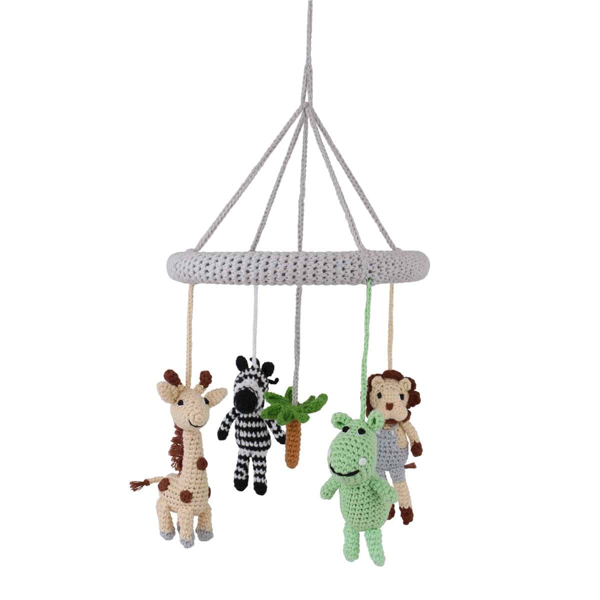 Handgefertigtes Baby-Mobile mit abnehmbaren Rasselfiguren im Safari-Motiv. Vier gehäkelte Tierfiguren und eine zentrale Dekorfigur lassen sich flexibel als Mobile, Greifrassel oder Hängespielzeug weiterverwenden.