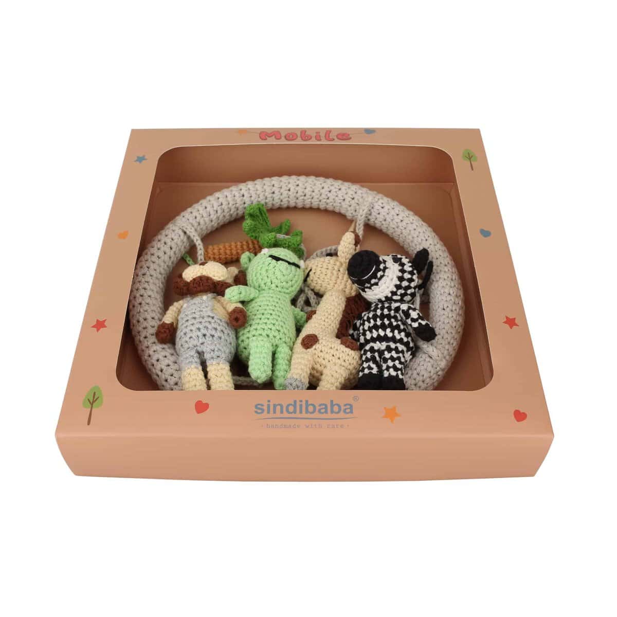 Das Baby-Mobile besteht aus mehreren frei hängenden Elementen sowie einer zentralen Figur. Alle Hängeelemente sind abnehmbar und können mit integrierten Rasseln ausgestattet sein.