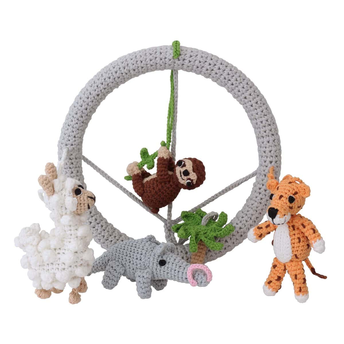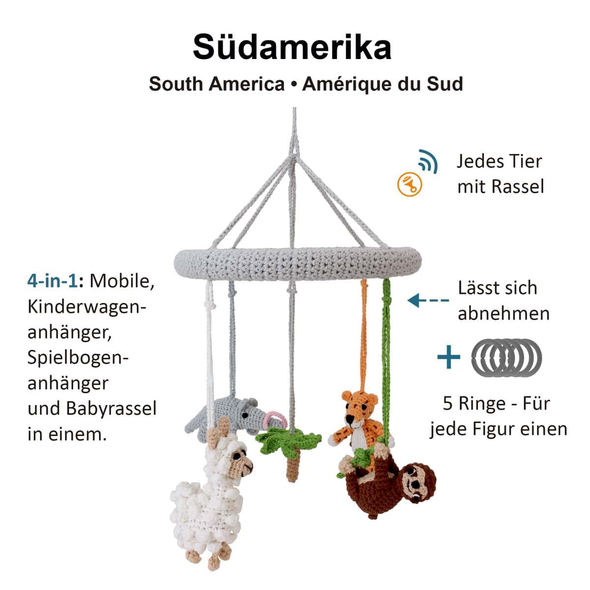 Handgefertigtes Baby-Mobile mit abnehmbaren Rasselfiguren im Südamerika-Motiv. Vier gehäkelte Tierfiguren und eine zentrale Dekorfigur lassen sich flexibel als Mobile, Greifrassel oder Hängespielzeug weiterverwenden.