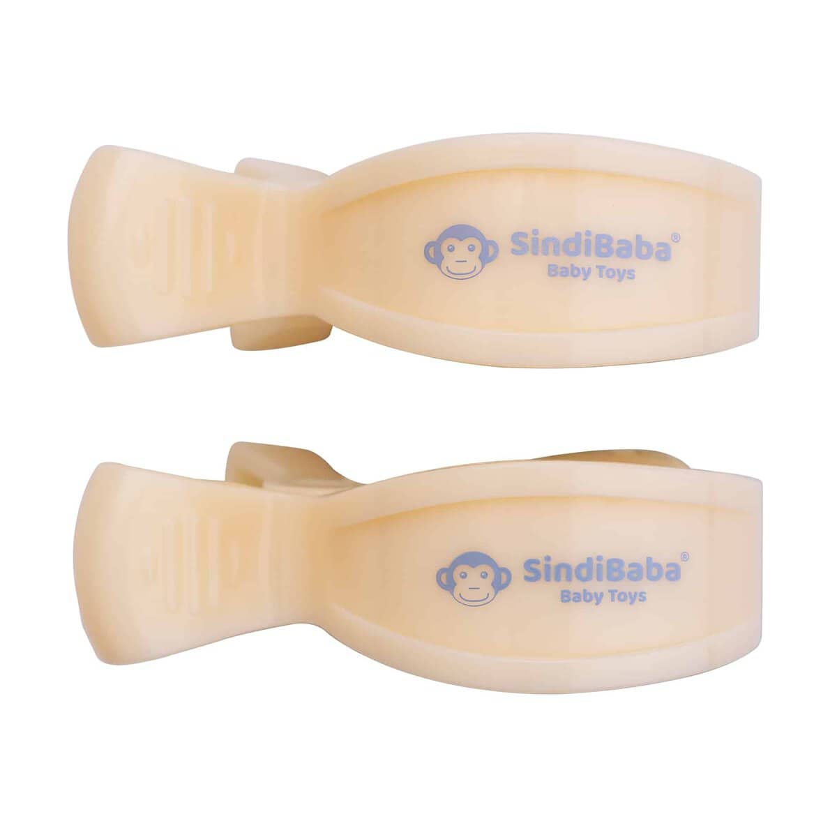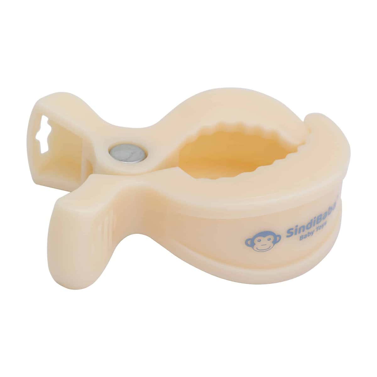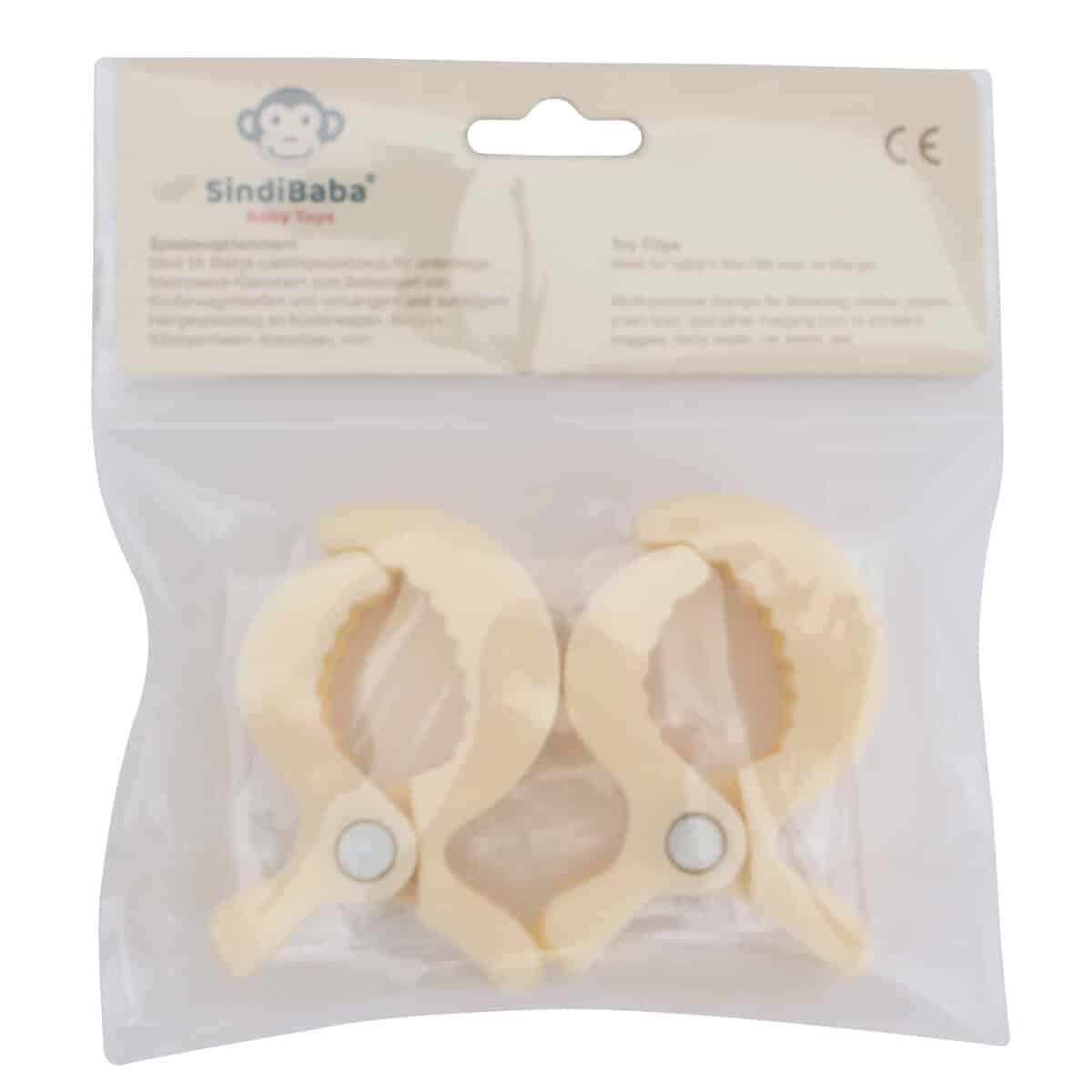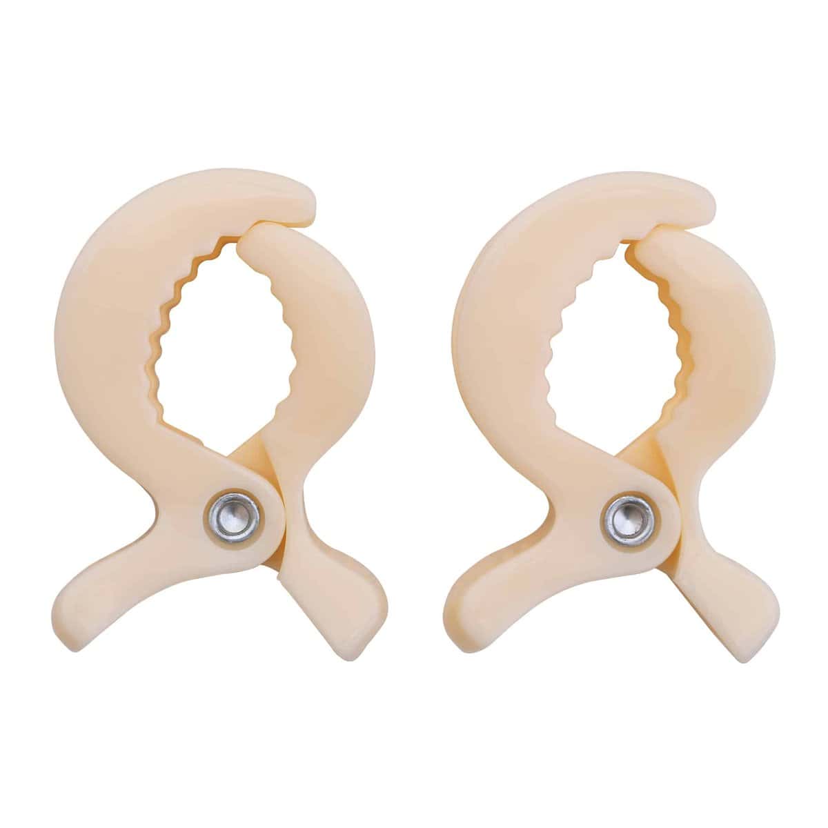 Befestigungsklammern im 2er Set in Beige (warmes Ecru-Sandshell) zur sicheren und flexiblen Fixierung von Babyspielzeug an Kinderwagen, Spielbögen oder Babyschalen.