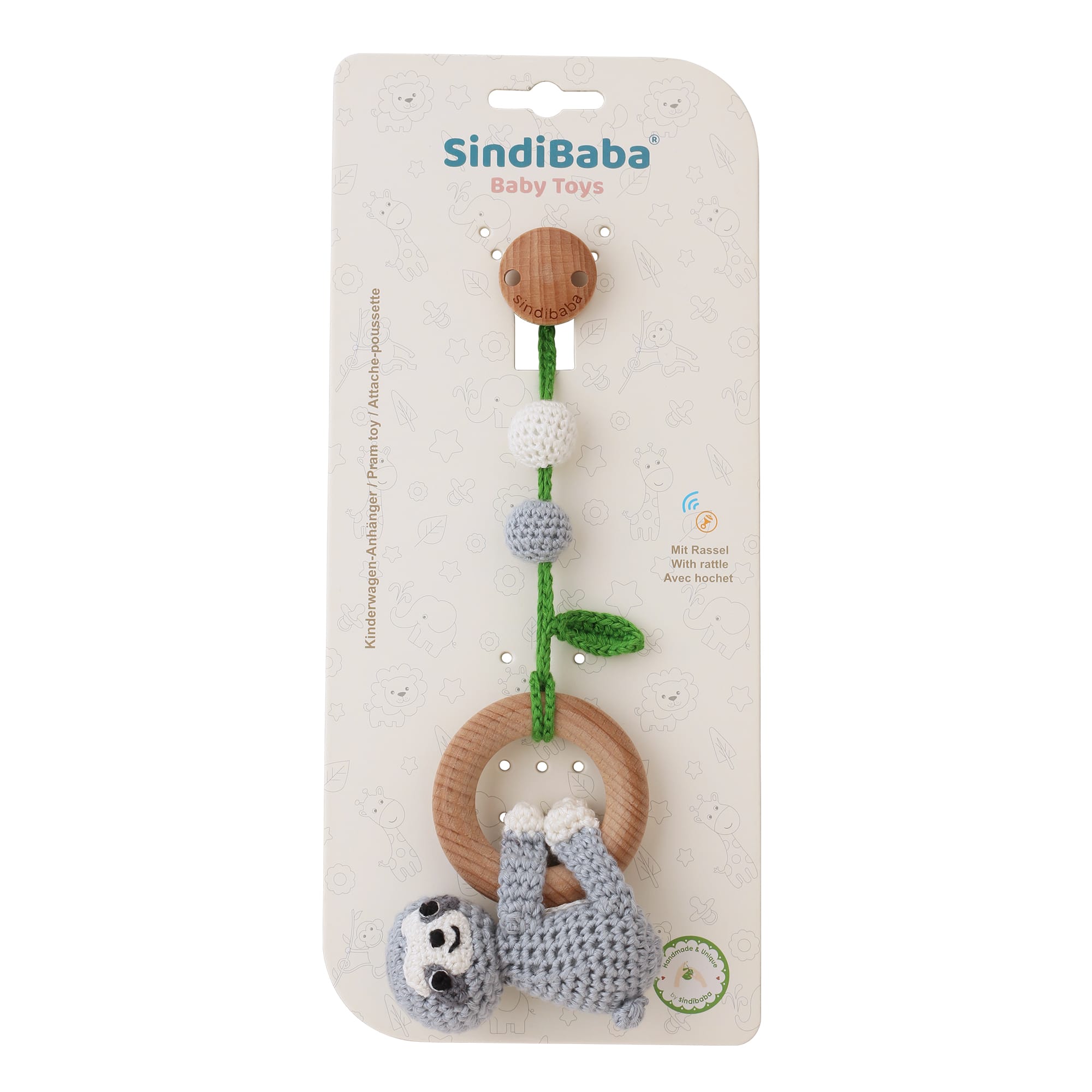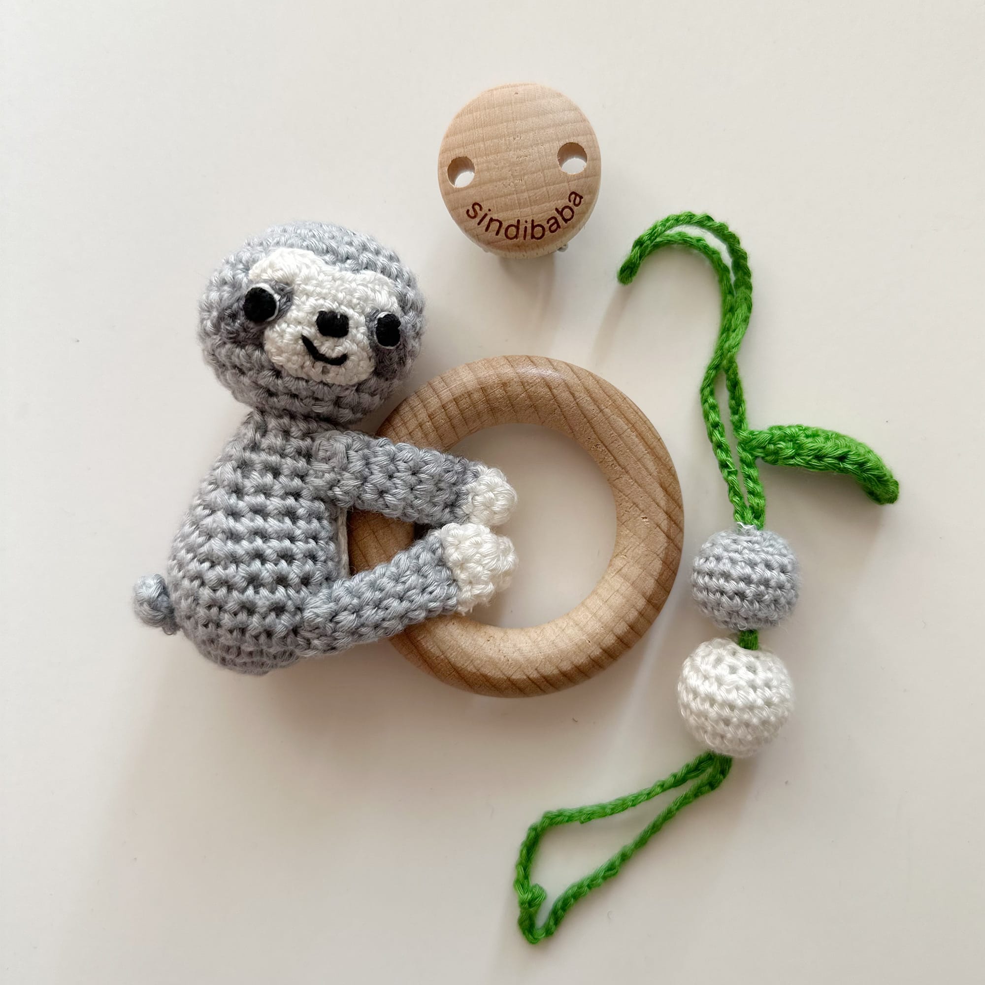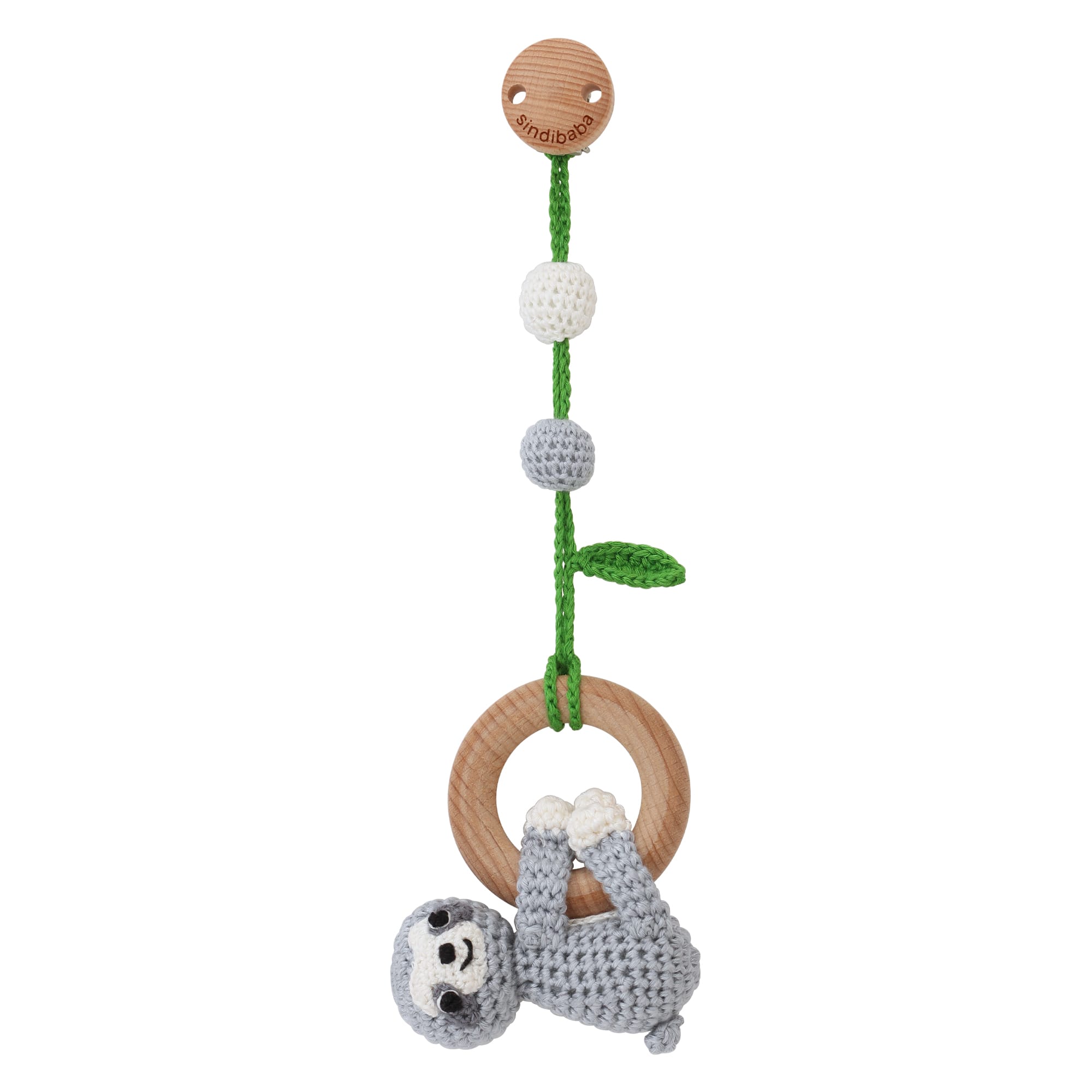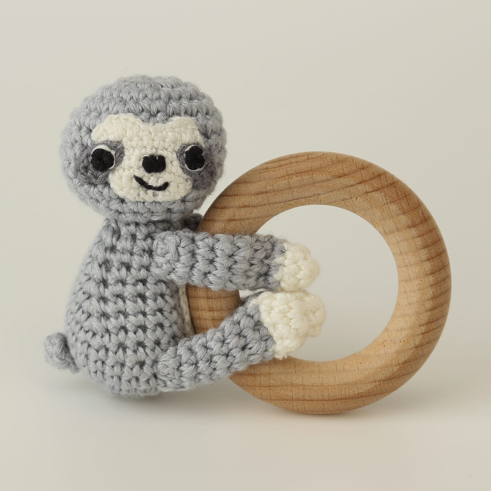 Handgefertigter Hänge-Greifling mit Faultiermotiv aus Bambusgarn und Holzring. Der Hänge-Greifling Faultier SLEEPY lässt sich flexibel aufhängen oder als klassischer Greifling verwenden und begleitet Babys beim Greifen, Beißen und Spielen.