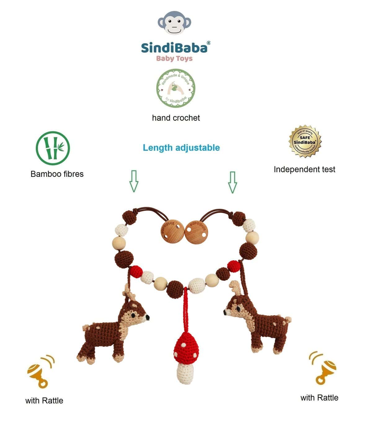 - Sinnesanregend: Häkelstruktur und integrierte Rassel fördern taktile und auditive Wahrnehmung.
