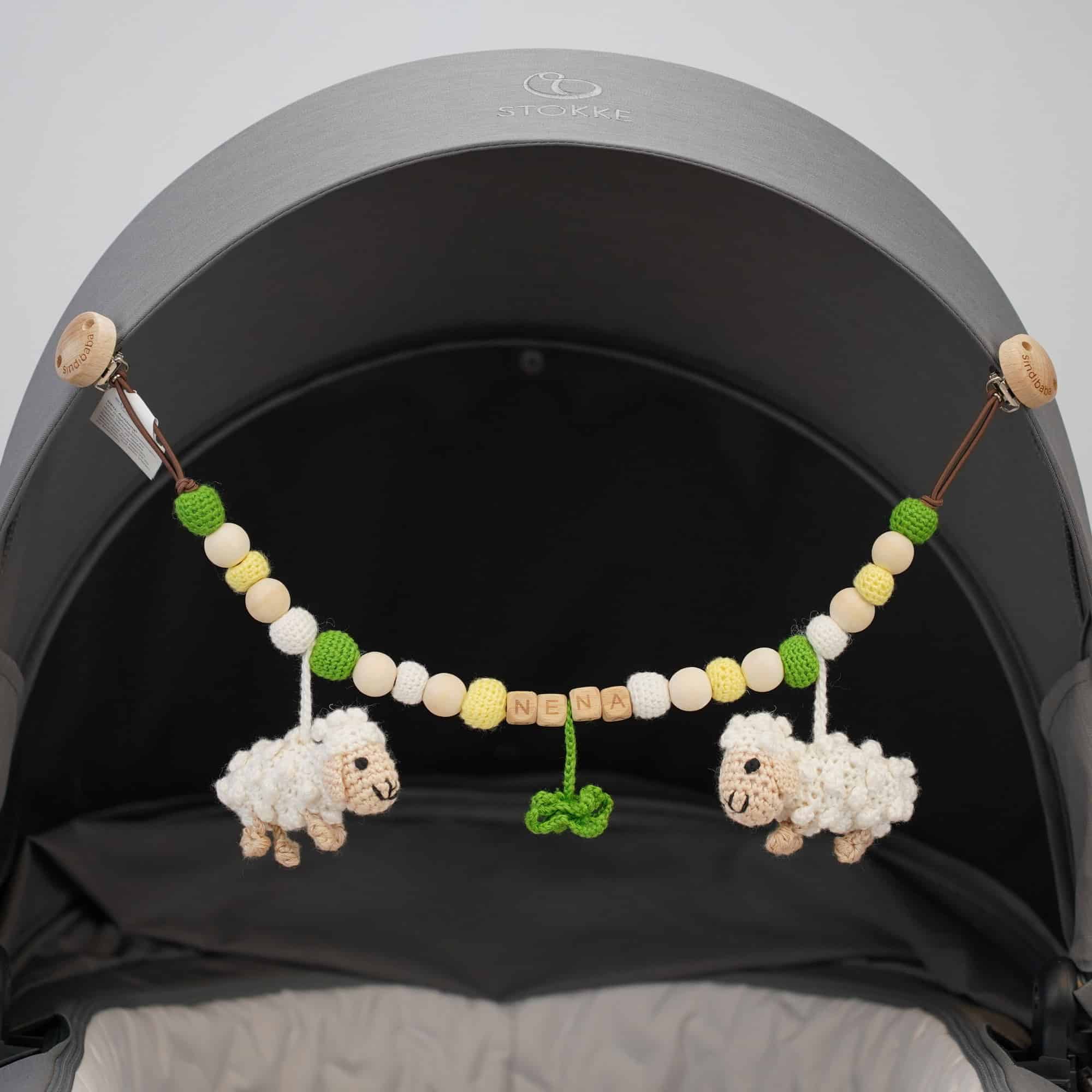 Handgefertigte Kinderwagenkette Schaf DOLLY aus Bio-Baumwolle und Holz.