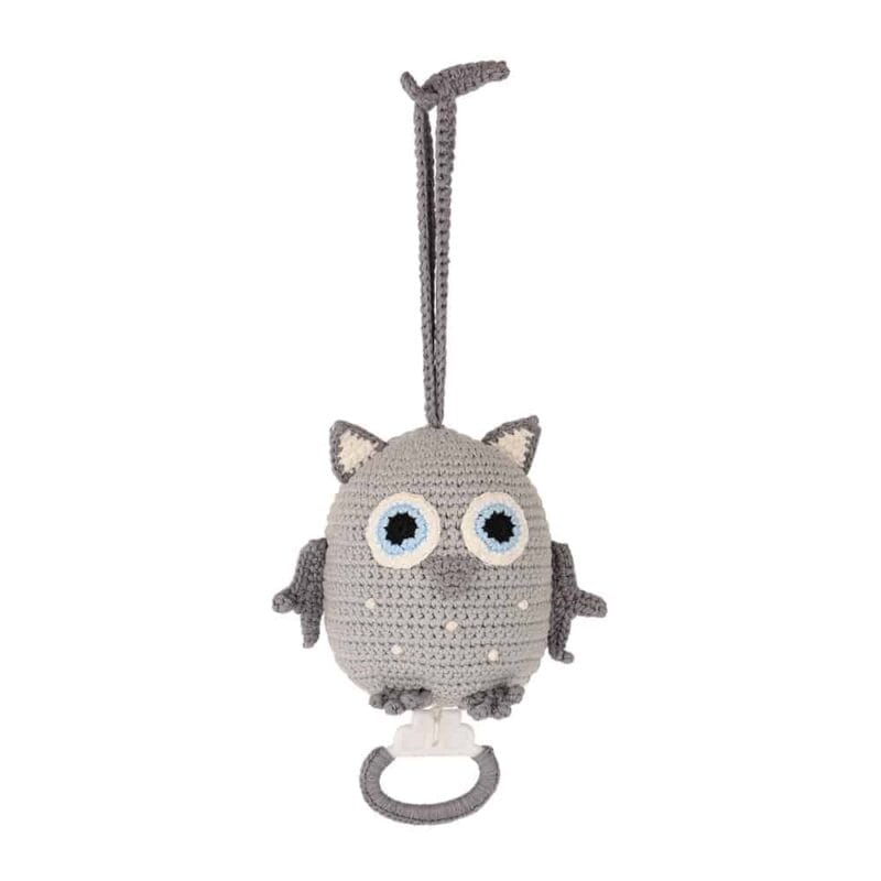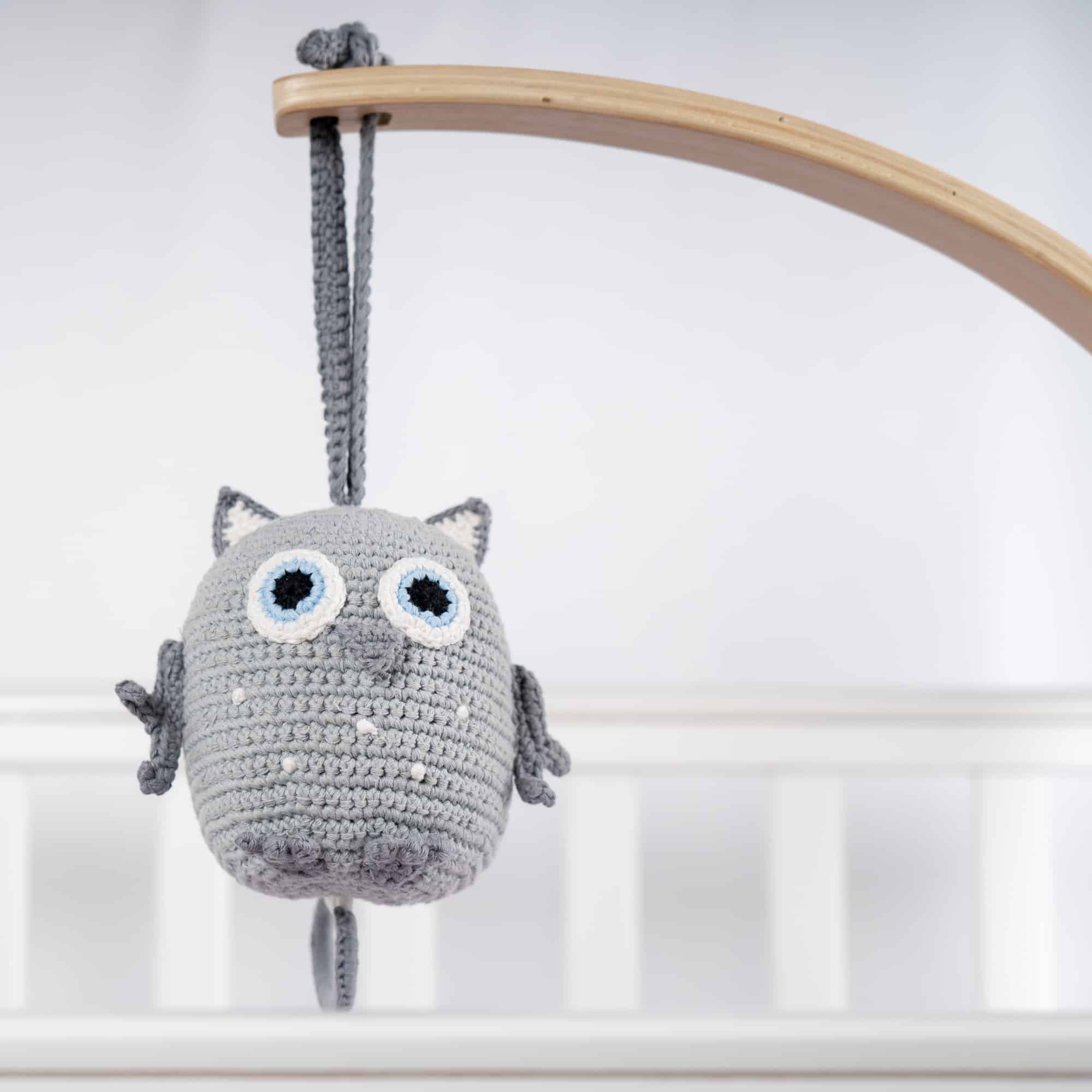 Handgefertigte Spieluhr mit Eulen-Motiv zur sanften Einschlafbegleitung.