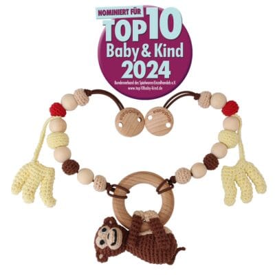 Handcrafted stroller chain with a detachable central monkey grasping toy.