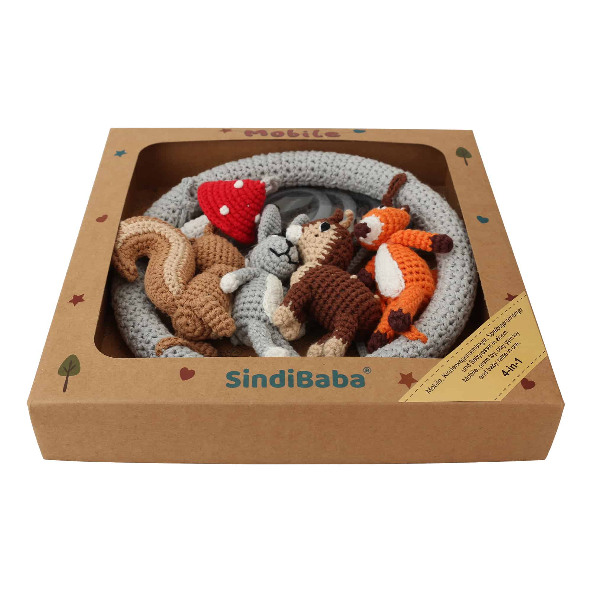 • Removable rattle figures: Four animal figures with integrated rattles plus one central decorative element.