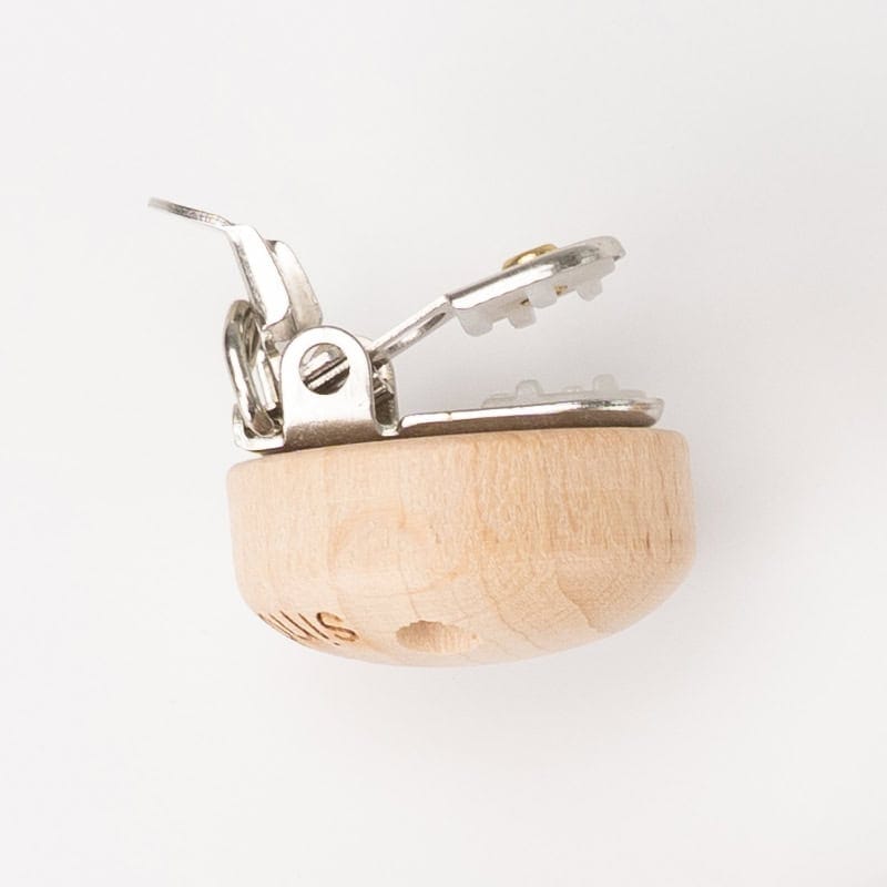 The beechwood attachment clip with metal clamp is designed for use in everyday baby environments. It allows pacifier chains, stroller chains, hanging toys or play gym attachments to be securely fixed to clothing, stroller canopies or other suitable attachment points.
