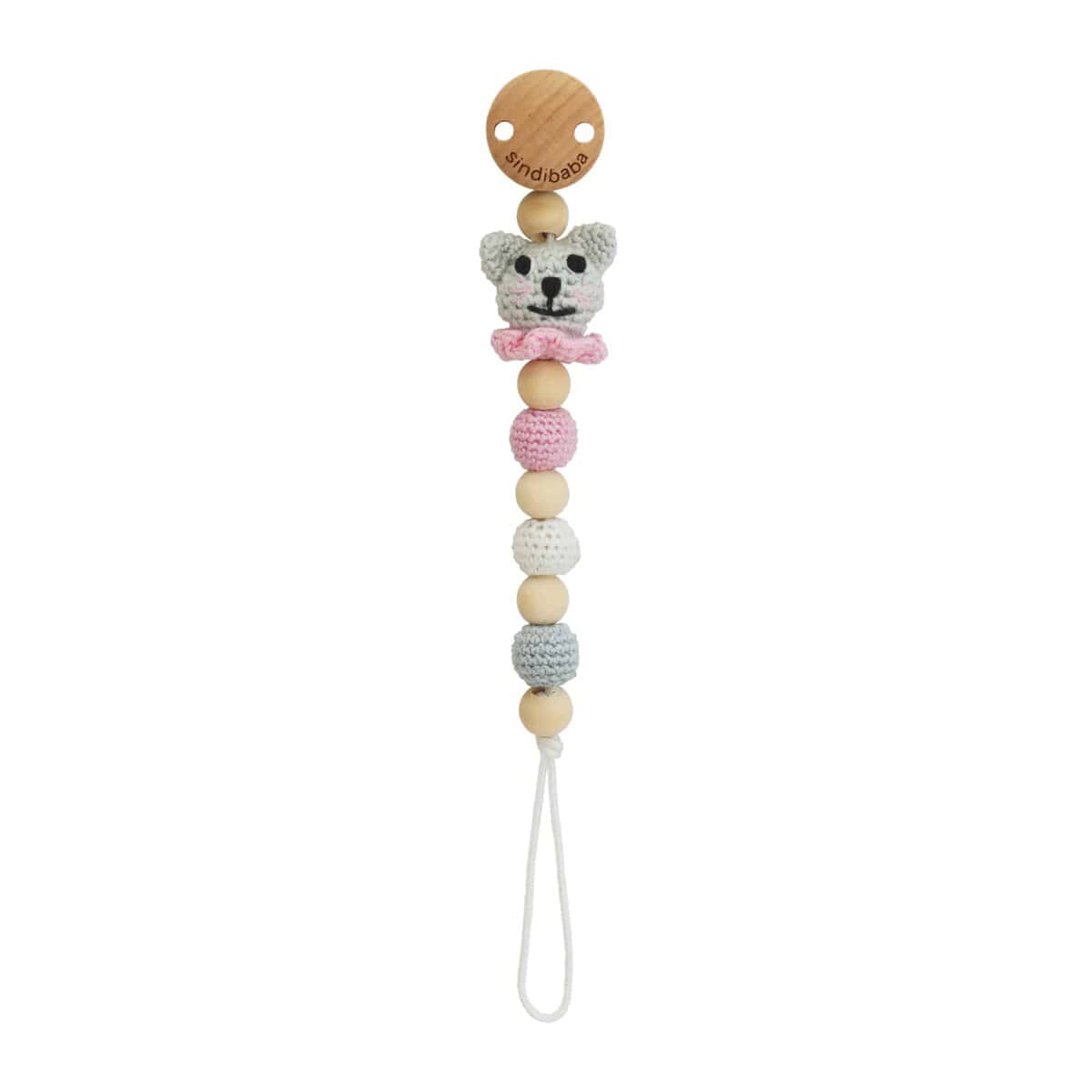 The pacifier clip is handcrafted from organic cotton and attached using a sturdy wooden clip made from untreated beechwood. Plastic parts, hard edges, and swallowable small components are intentionally avoided.