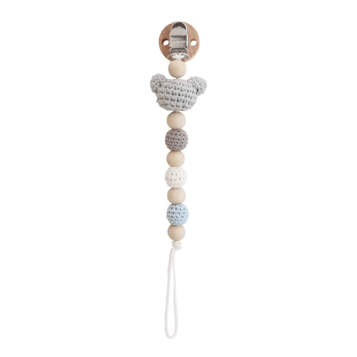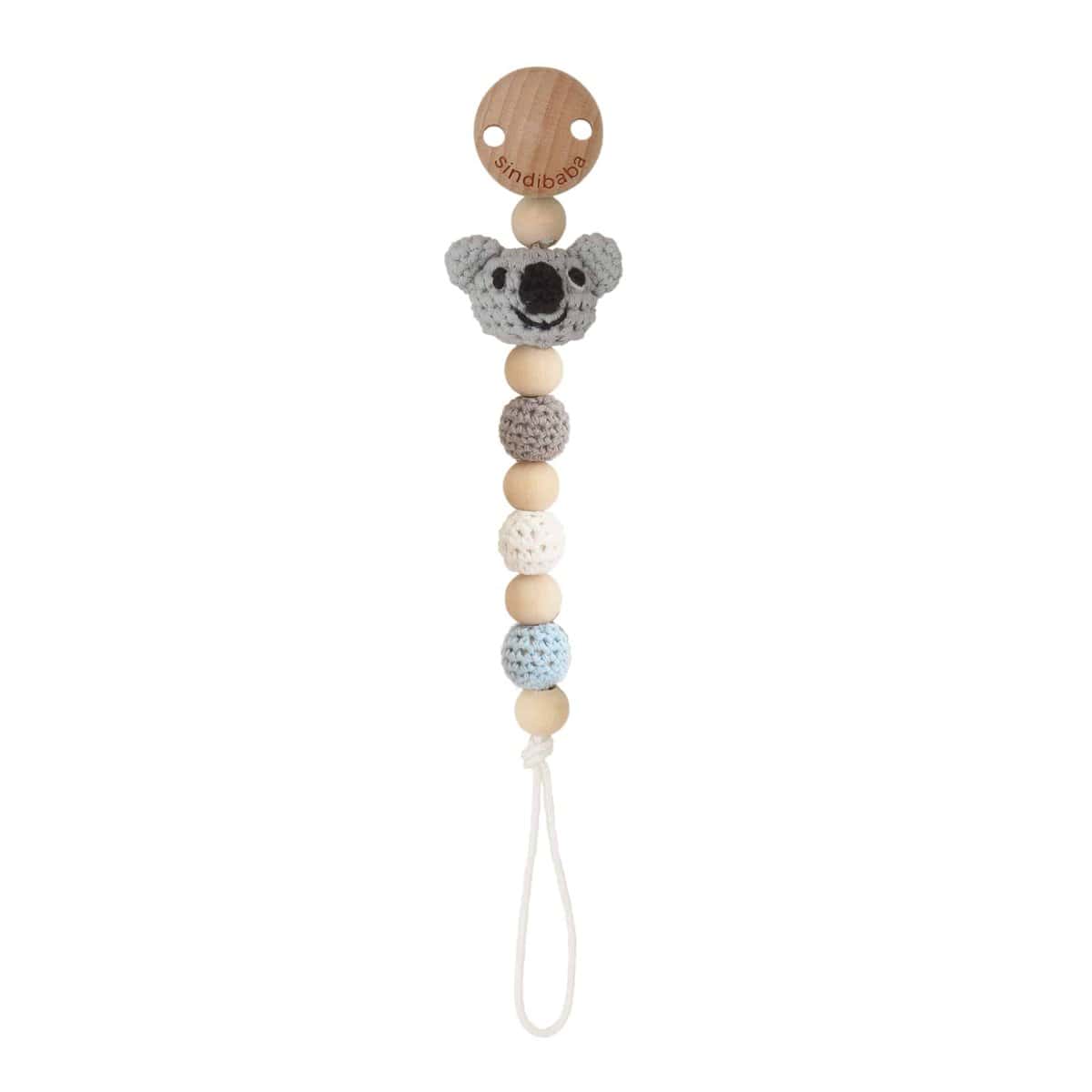 Handcrafted pacifier chain with koala motif made from organic cotton.