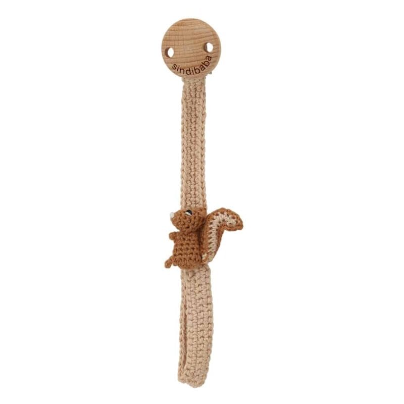Handcrafted pacifier strap with squirrel motif.