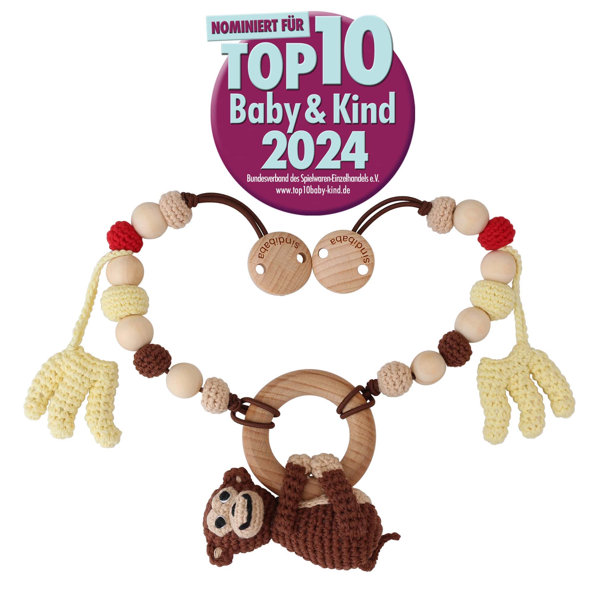 This special stroller chain intentionally differs from classic stroller chains. Instead of multiple hanging figures, a larger monkey grasping toy is mounted centrally between two cords. This creates a focused play and grasping element that is easy for babies to reach.