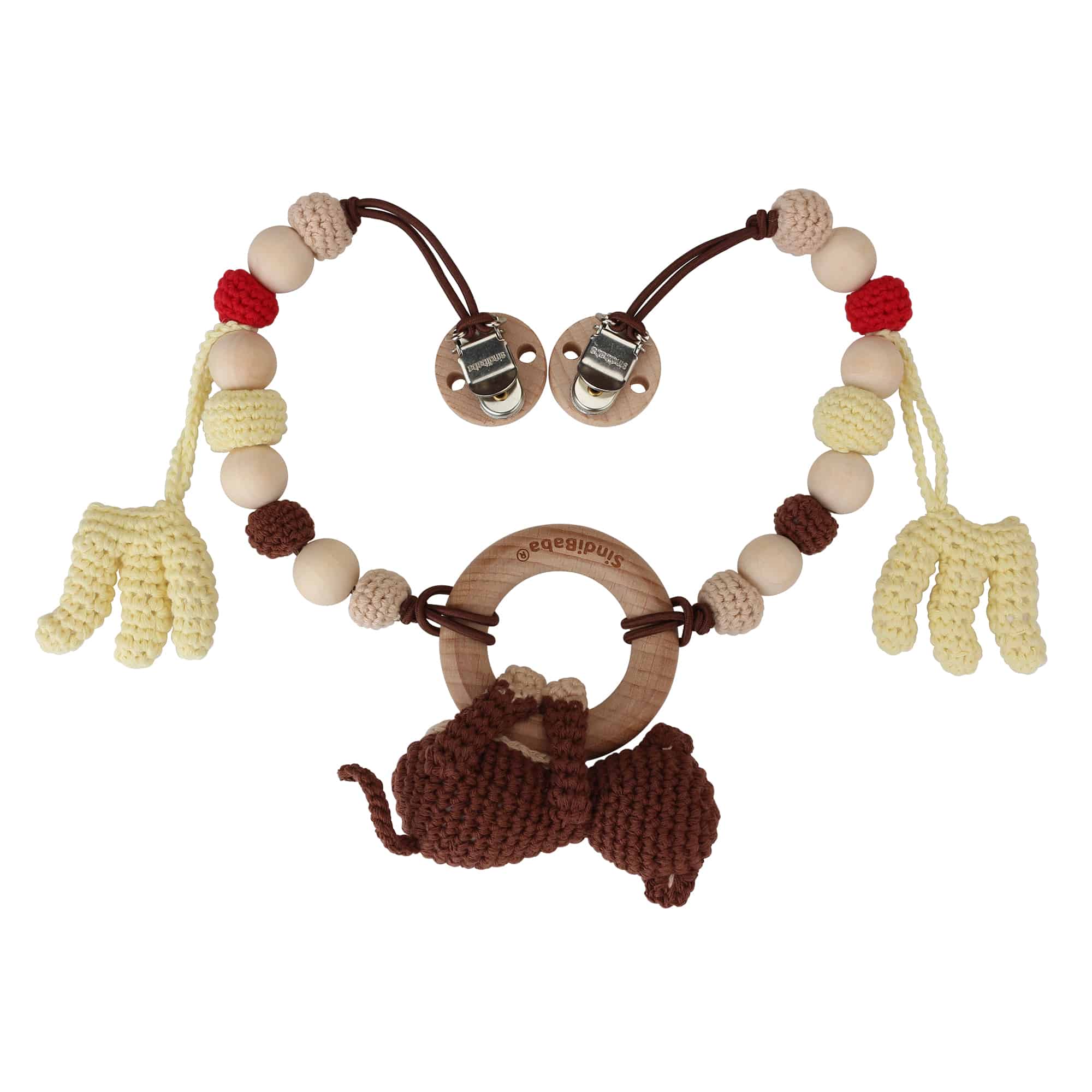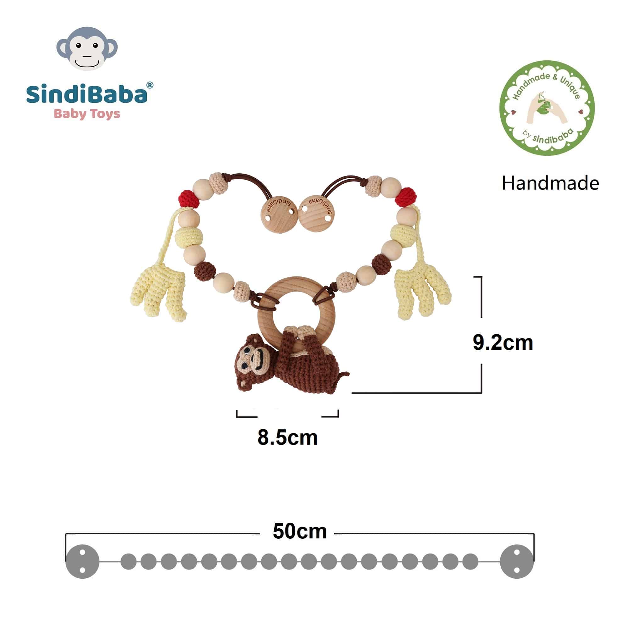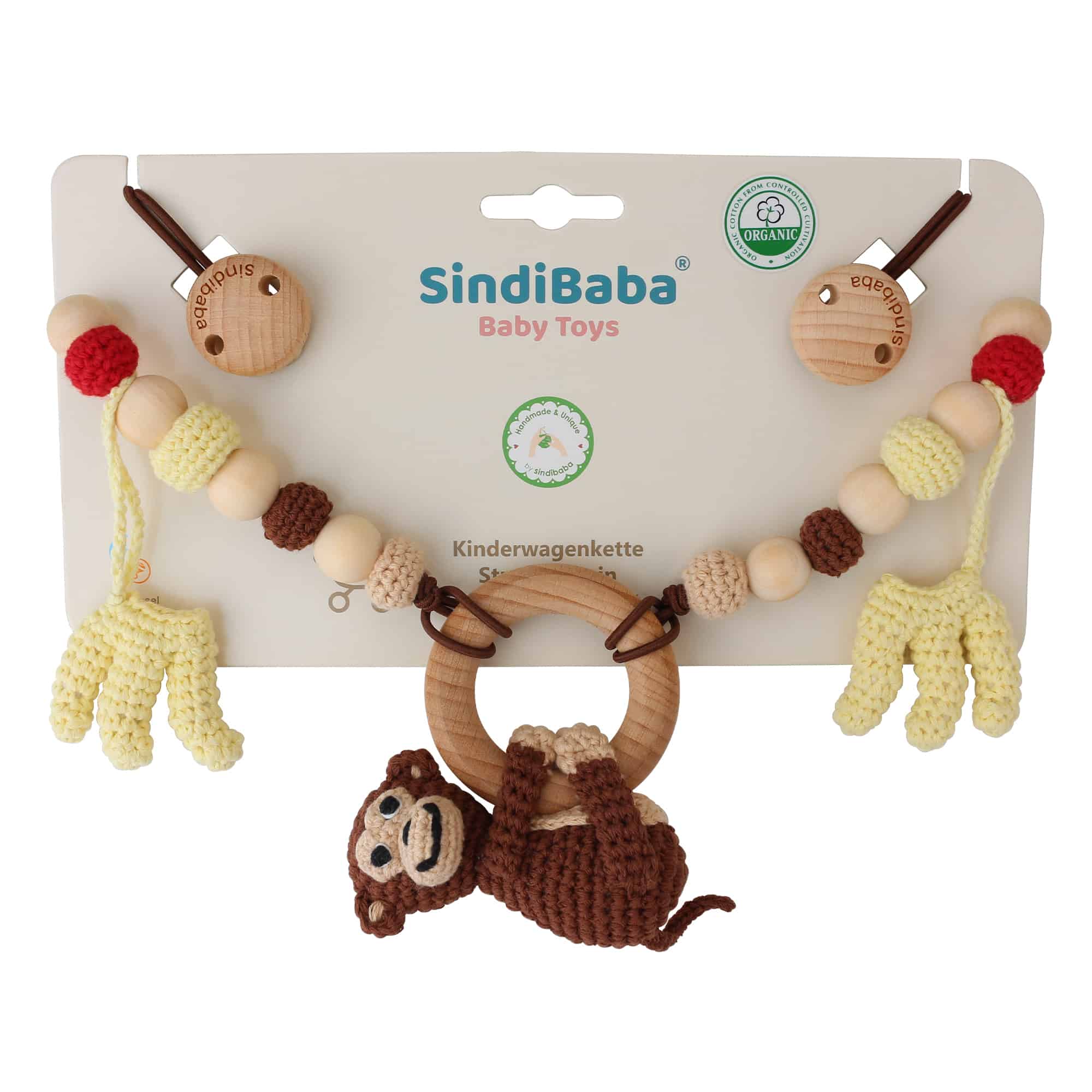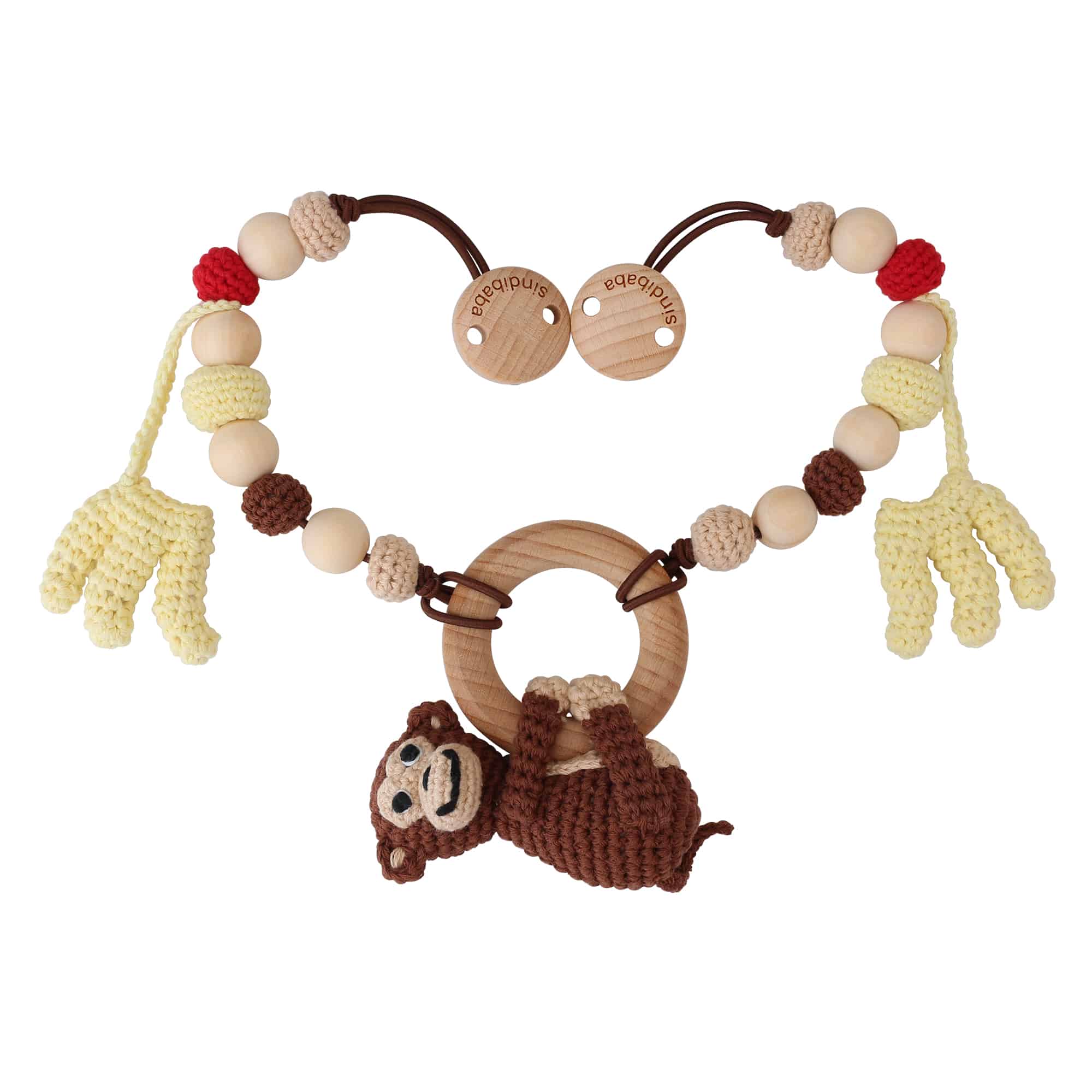 Handcrafted stroller chain with a detachable central monkey grasping toy.