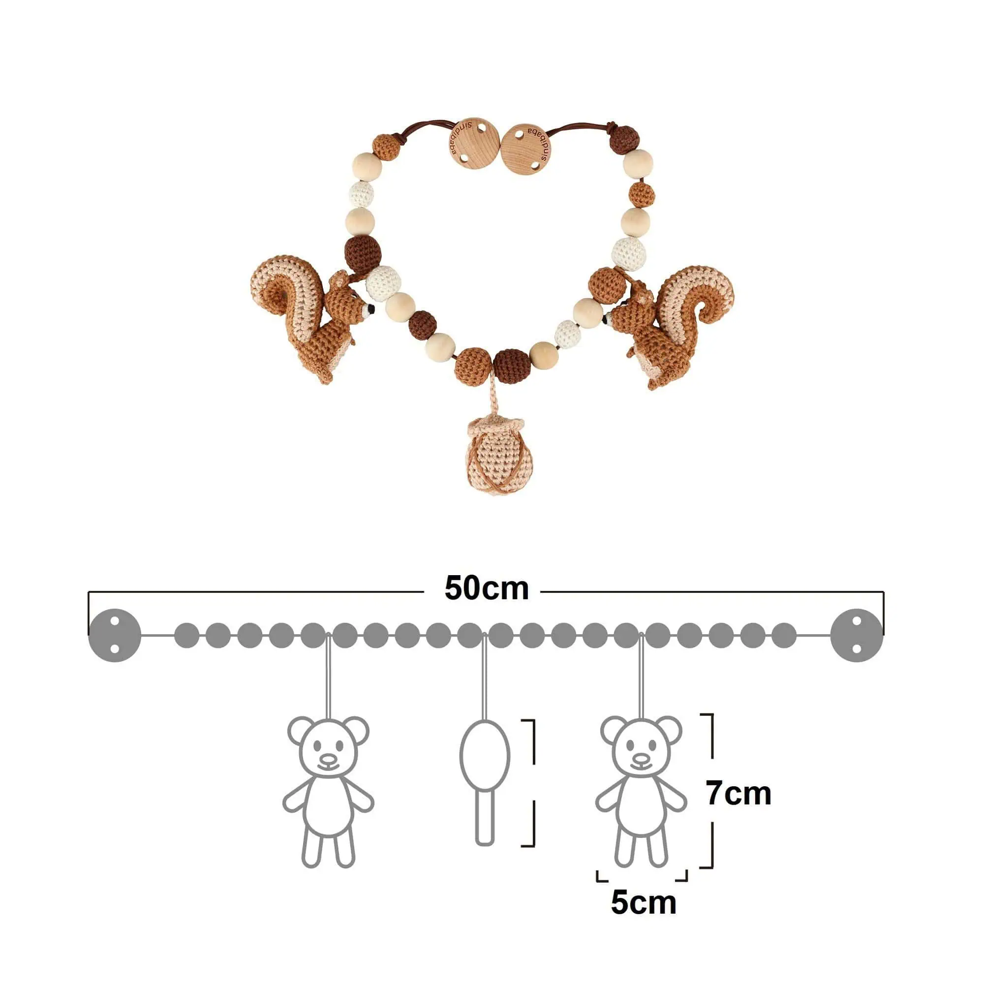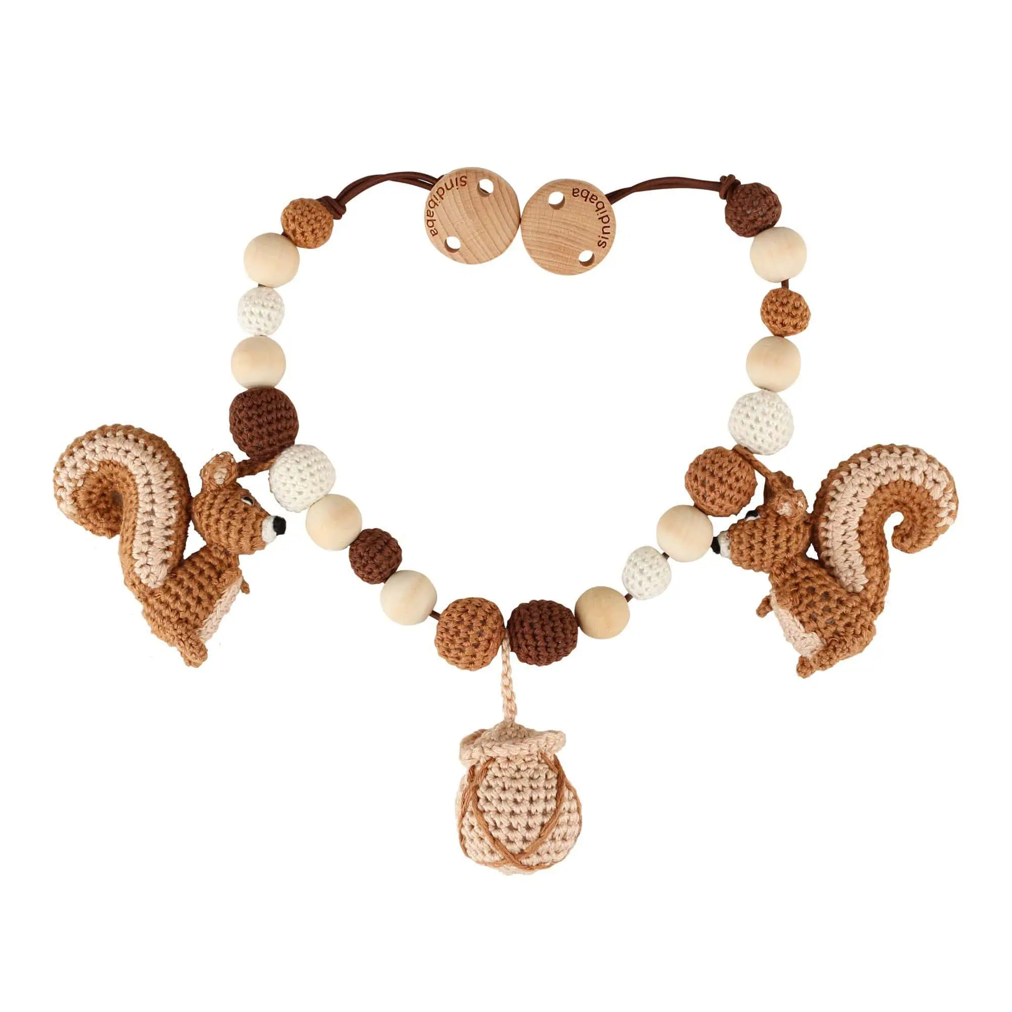 Handcrafted stroller chain Squirrel NUTTY made from organic cotton and wood.